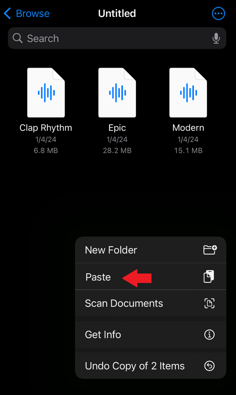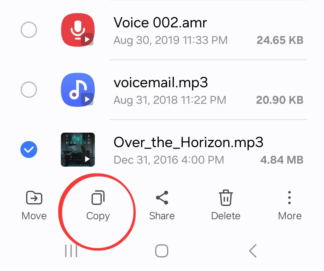 - Copying a single MP3 file – Press and hold on the file you want to transfer and select “Copy”