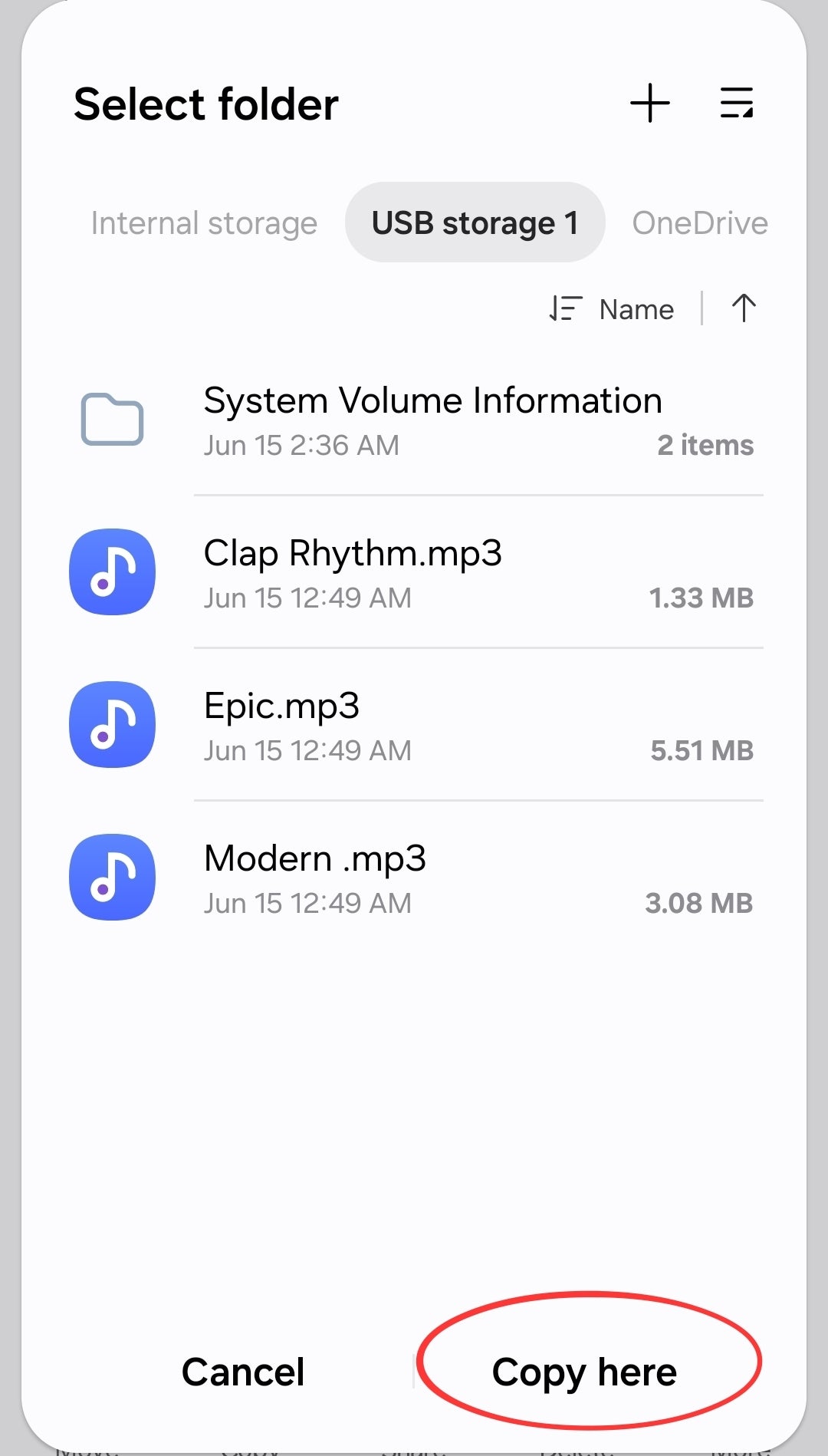 After copying, you are done. You can go to My Files and tap the 3 dots next to USB storage and then tap Unmount.